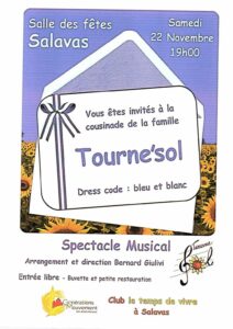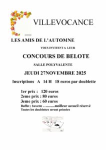 Transmettez nous vos affiches pour une diffusion la plus large possible. Cliquez sur les affiches pour un affichage plein écran Le 22 novembre spectacle musical à Salavas Secteur Lagorce Le 23 novembre repas dansant à St Etienne de Fontbellon Secteur de St Etienne de Fontbellon Le 27 novembre concours de belote à Villevocance Secteur Ardèche nord